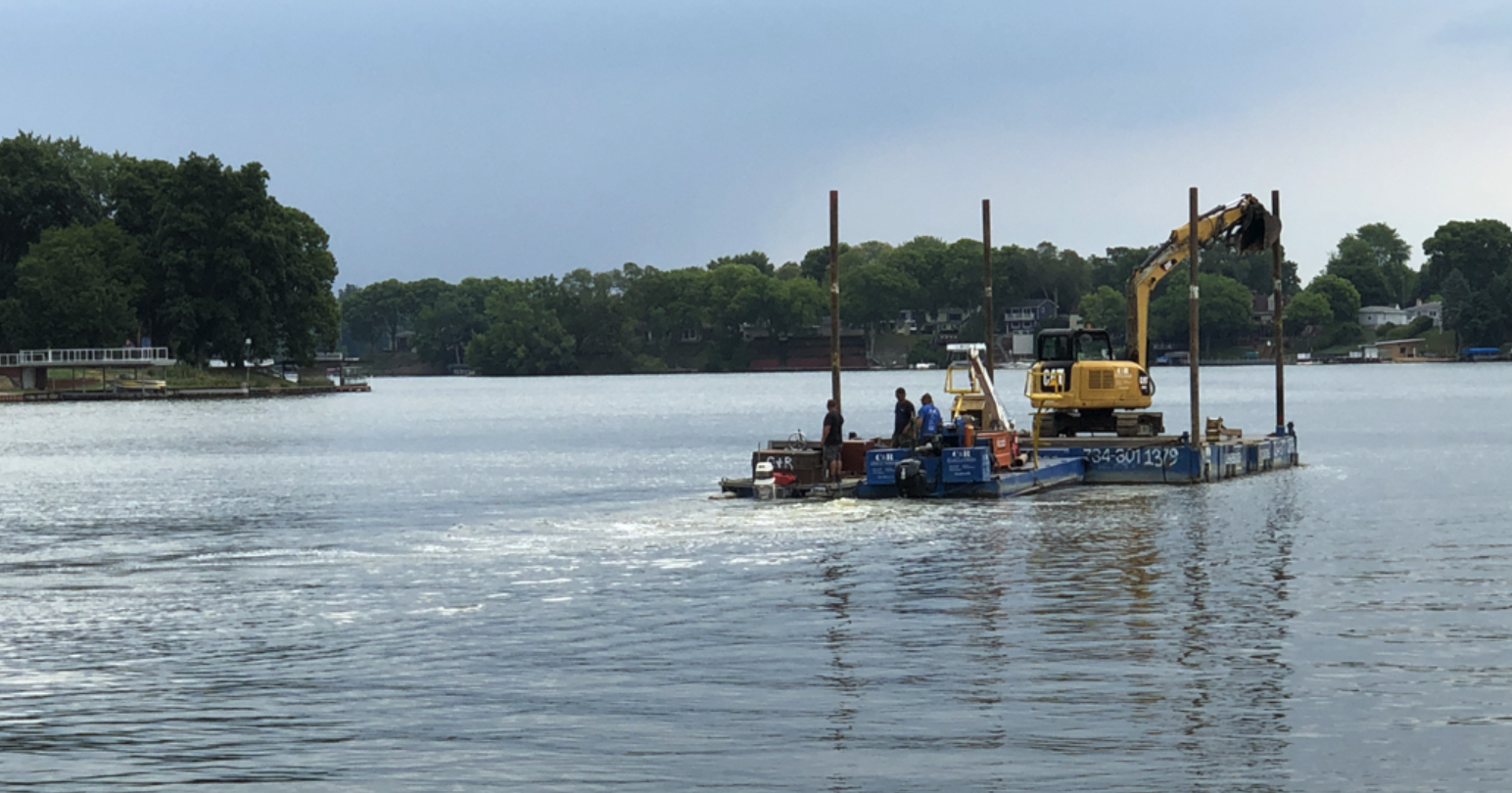 When C&R Lakeside Landscape builds docks, piers, retaining walls, and any other large projects that require large construction equipment, we won’t drive it across your flower garden. We’ll float it in waterside on our rugged, custom-built construction barge, and use it as our sturdy base of operations. It gives us direct access to the site, and allows us to perform all the heavier duty aspects of your waterfront development or redevelopment. From the barge, we’ll float in and install pier and dock piles, build the entire dock, construct your retaining wall, bring in or remove large rocks, and even our excavator and other large equipment that may be needed for site prep or landscaping.
